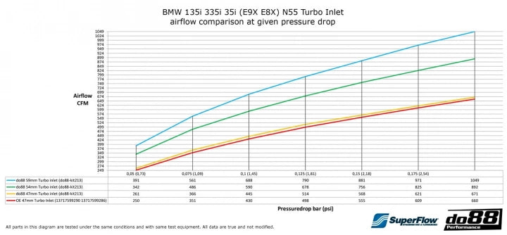 - Airflow (59mm version) at 0.175 bar / 2.54 psi pressure drop: 1049 CFM (660 CFM), 59% higher than OE! See diagram under product images.