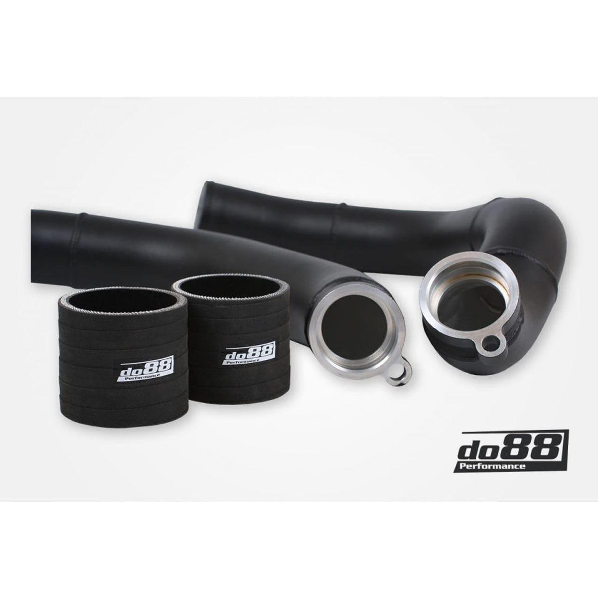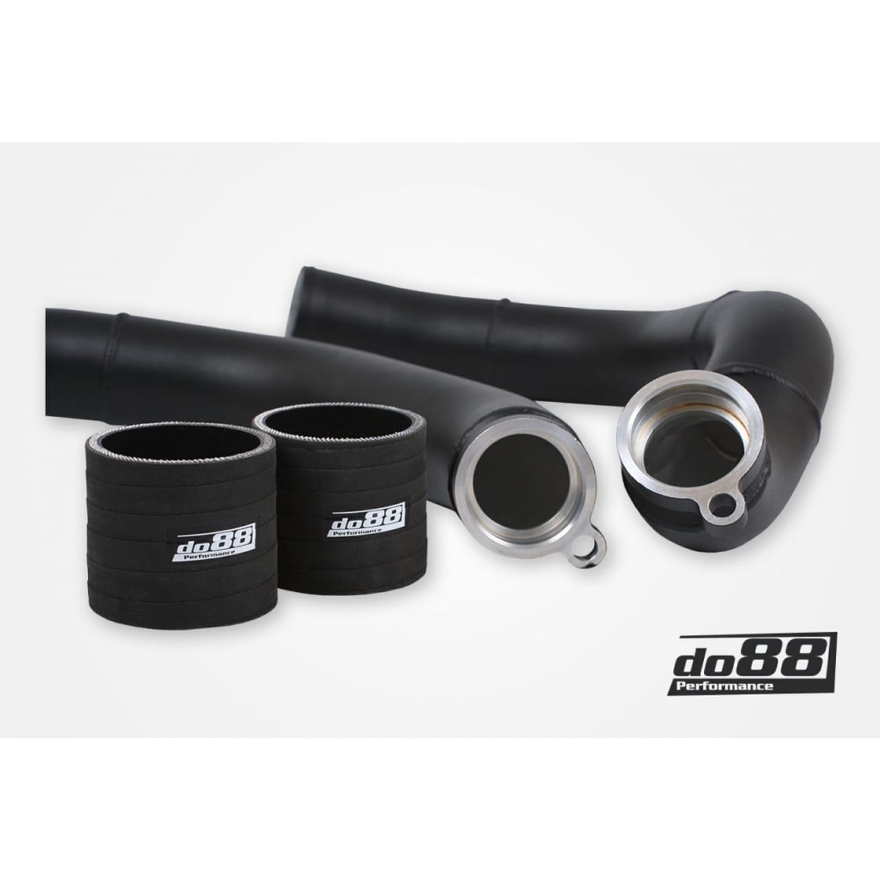Unser endgültiges Design ist eine Vollaluminium-Konstruktion mit dorngebogenen Rohren und CNC-gefrästen Turboflanschen. Wir liefern auch haltbarere Silikonschläuche mit, die unsere Rohre mit den Ladeluftkühler-Einlassflanschen verbinden. Für einen coolen, unauffälligen Look werden mattschwarze Schlauchschellen mitgeliefert.