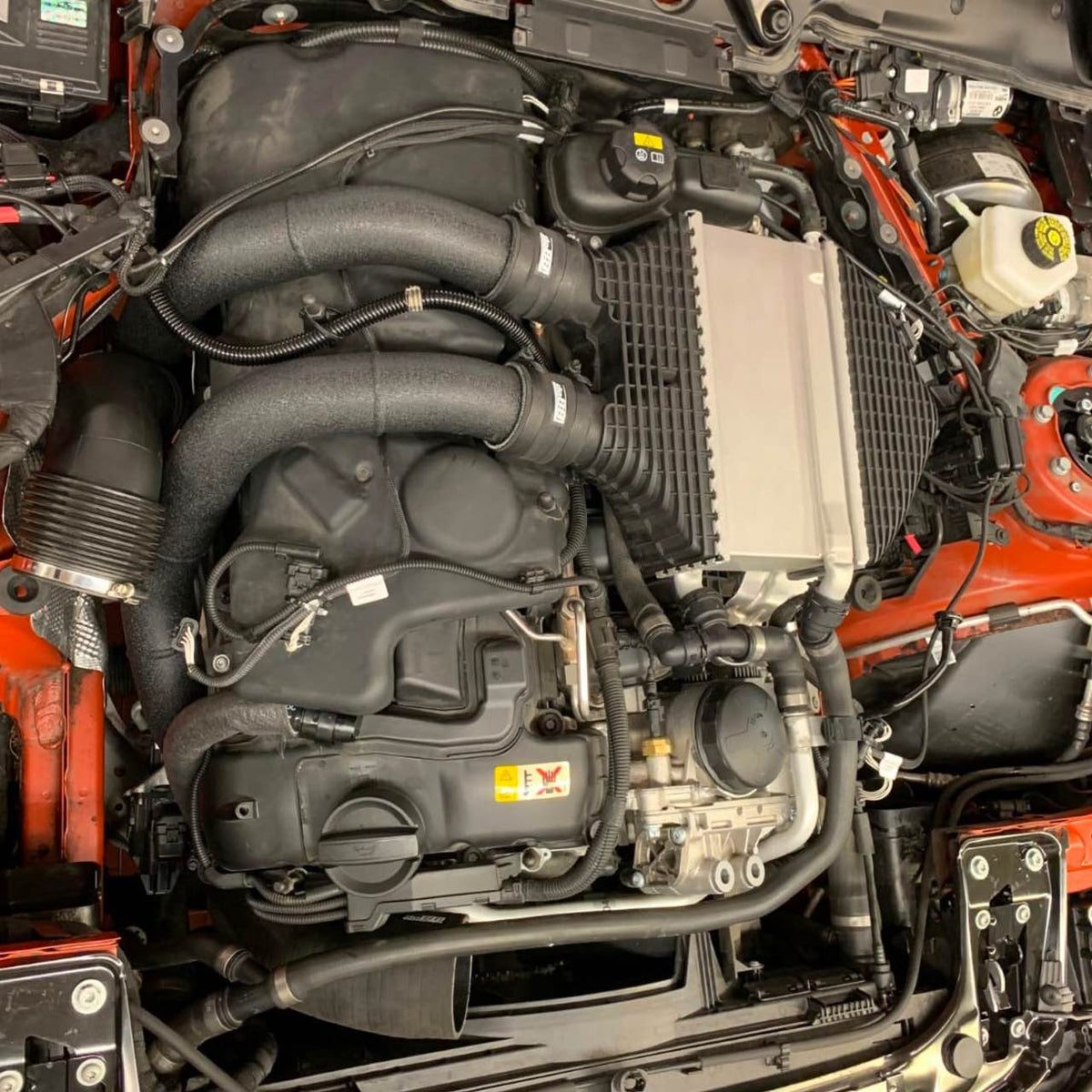 Es ist eine Herausforderung, so große Rohre wie 2,25″ (57 mm) einzubauen, da zwischen Motordeckel und Ventildeckel nicht so viel Platz ist. Viele Aftermarket-Ladeluftkühlerrohre machen es unmöglich, die Gummitüllen der Motorabdeckung korrekt auf deren Sicherungsstifte aufzuschnappen. Wir haben dieses Problem durch unser Design dieses Rohrs und dadurch gelöst, dass wir längere Verriegelungsrohre im OE-Stil für die Motorabdeckung beifügen.